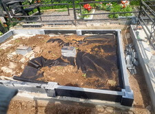 Укрываем внутреннюю зону участка геотекстилем и приносим три массивные прямоугольные плиты, которые в дальнейшем послужат наземным покрытием могилы.